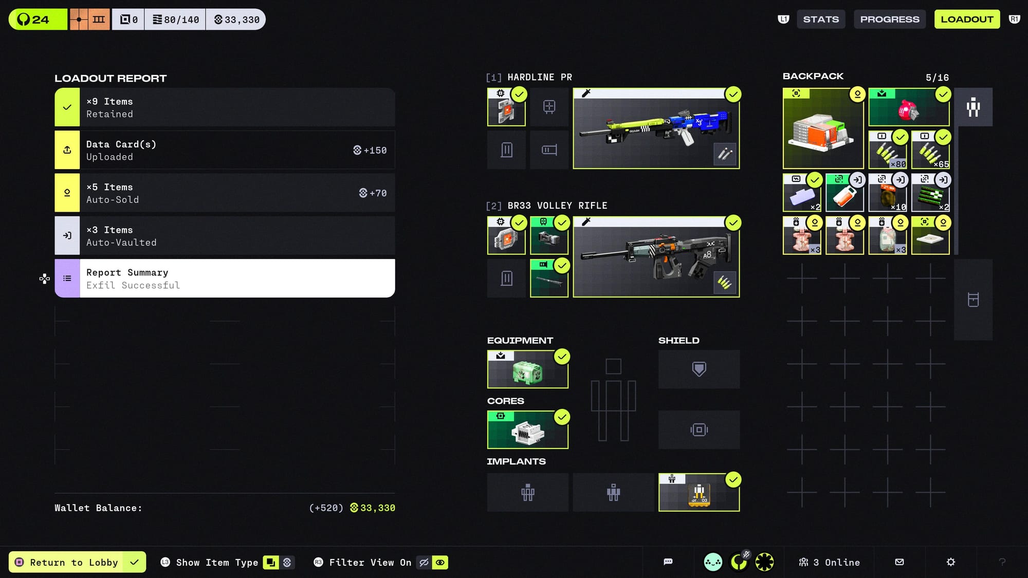 Essentially, I stopped treating the game as a constant loot treadmill to continually acquire and hoard better and better stuff. Instead, I prioritized completing the contracts that the game's different factions gave to me as those put me on the path to gain permanent upgrades for my account as well as unfolding the game's narrative. (I'm a big stories guy so this is a bigger motivator for me than just wanton wealth accumulation or player griefing)